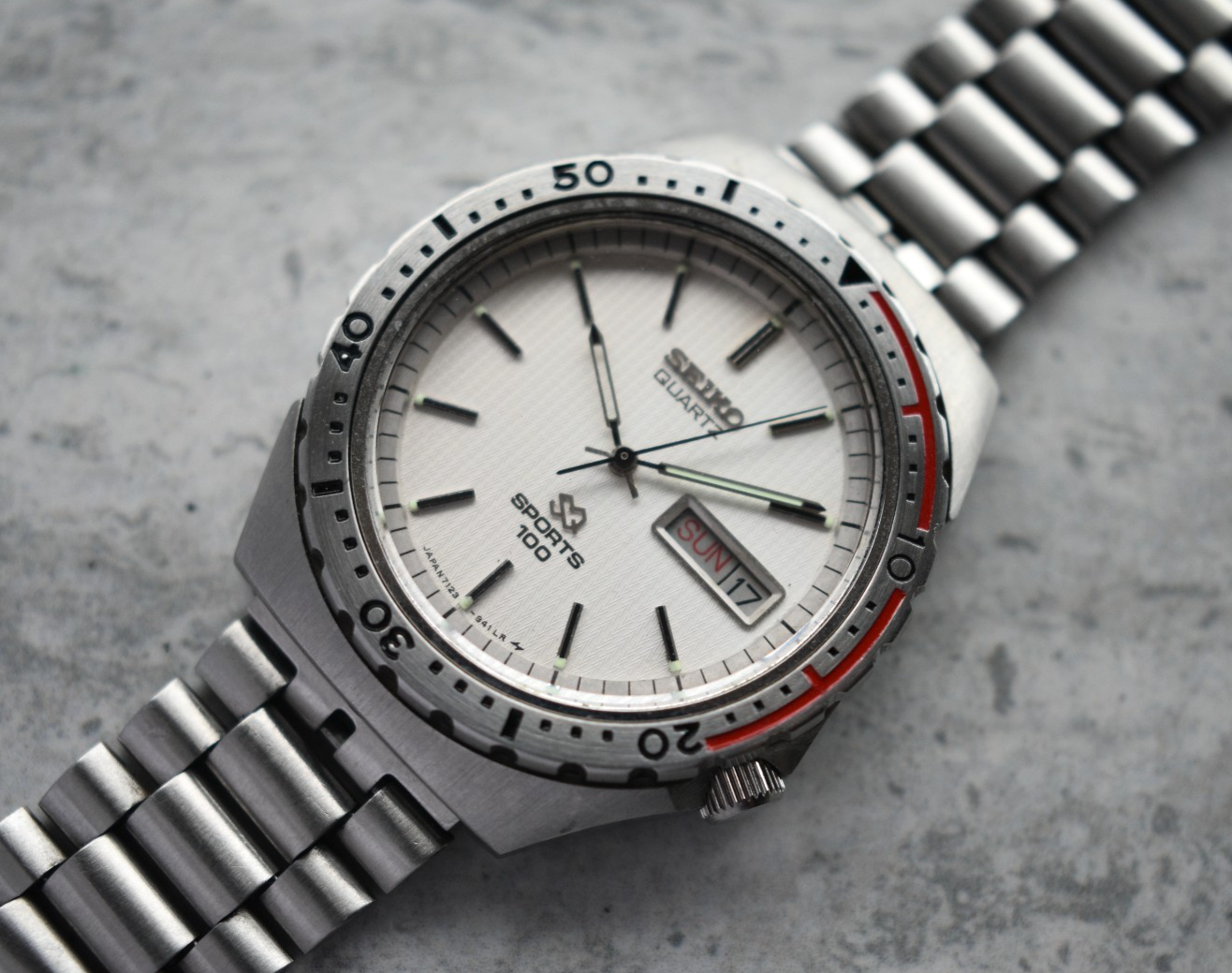June 1982 Seiko Sports SQ Silver Dial Steel Bracelet Men's Watch Day Date