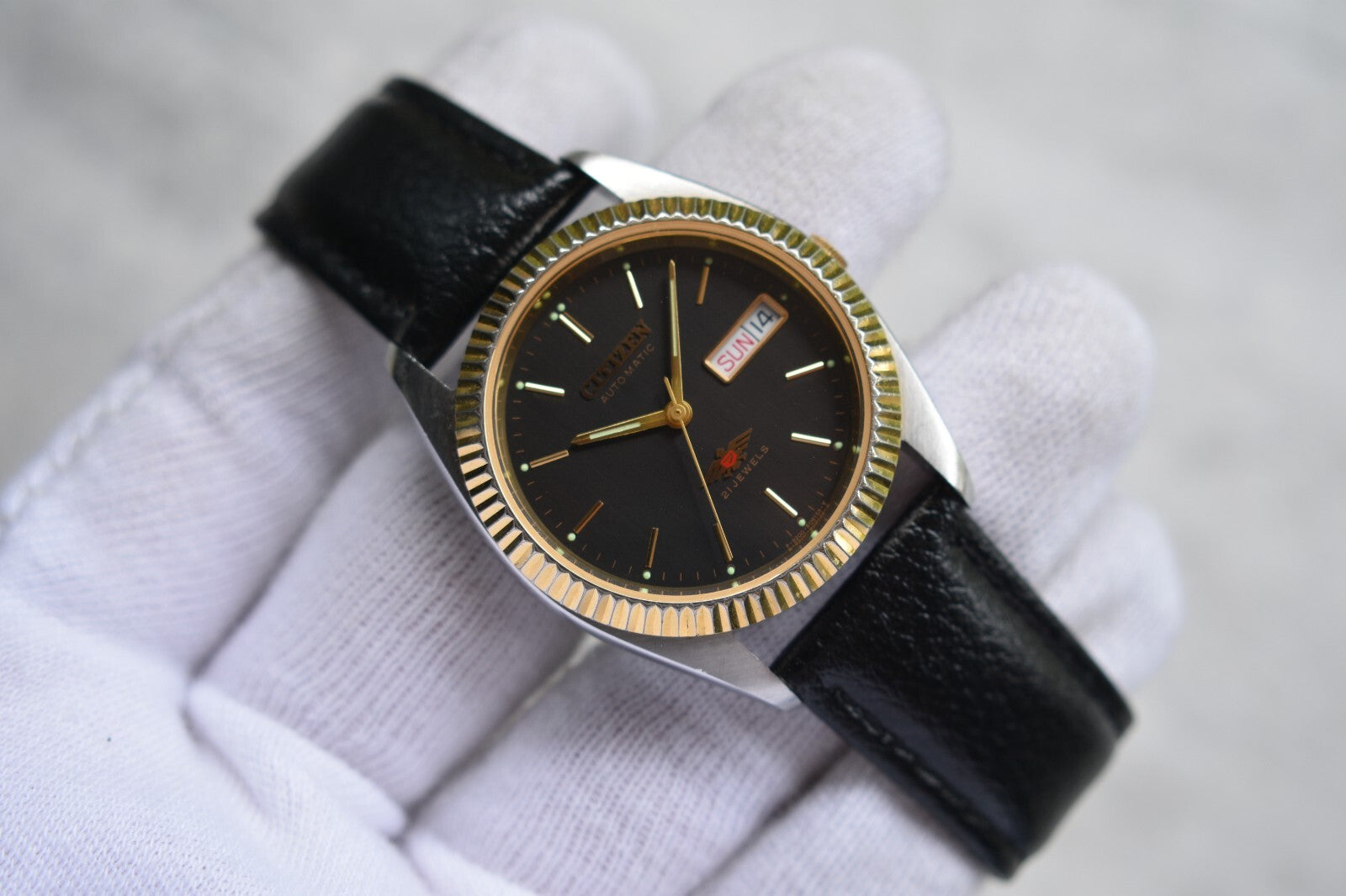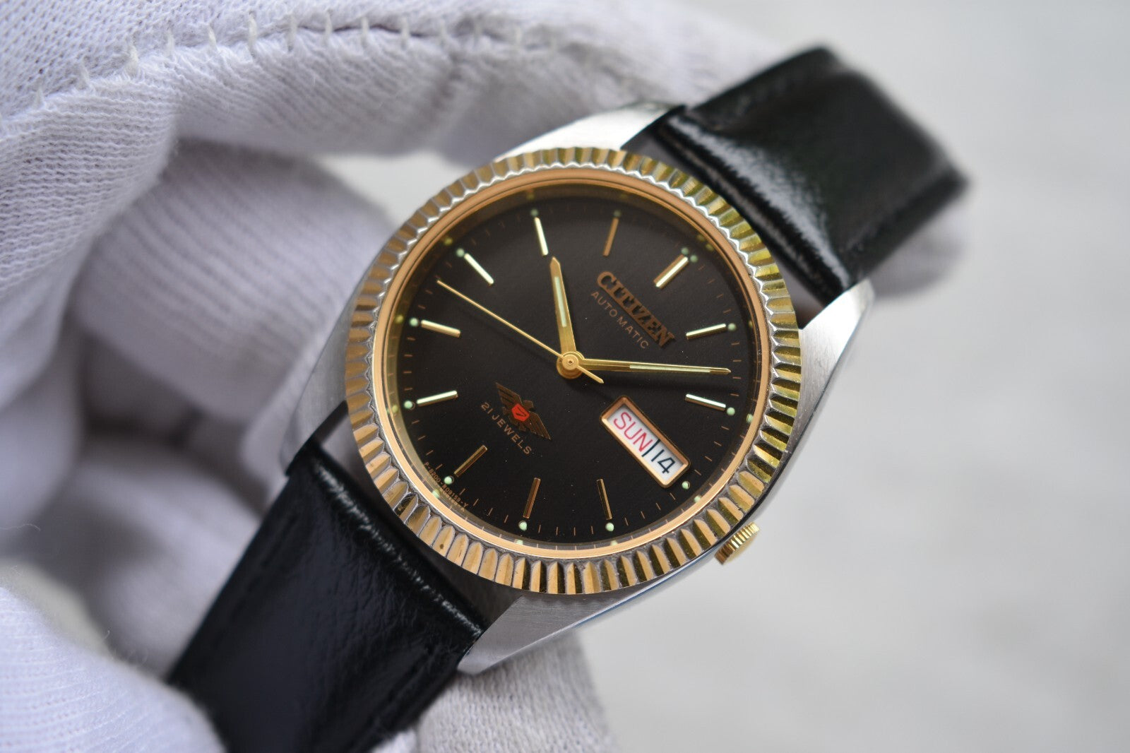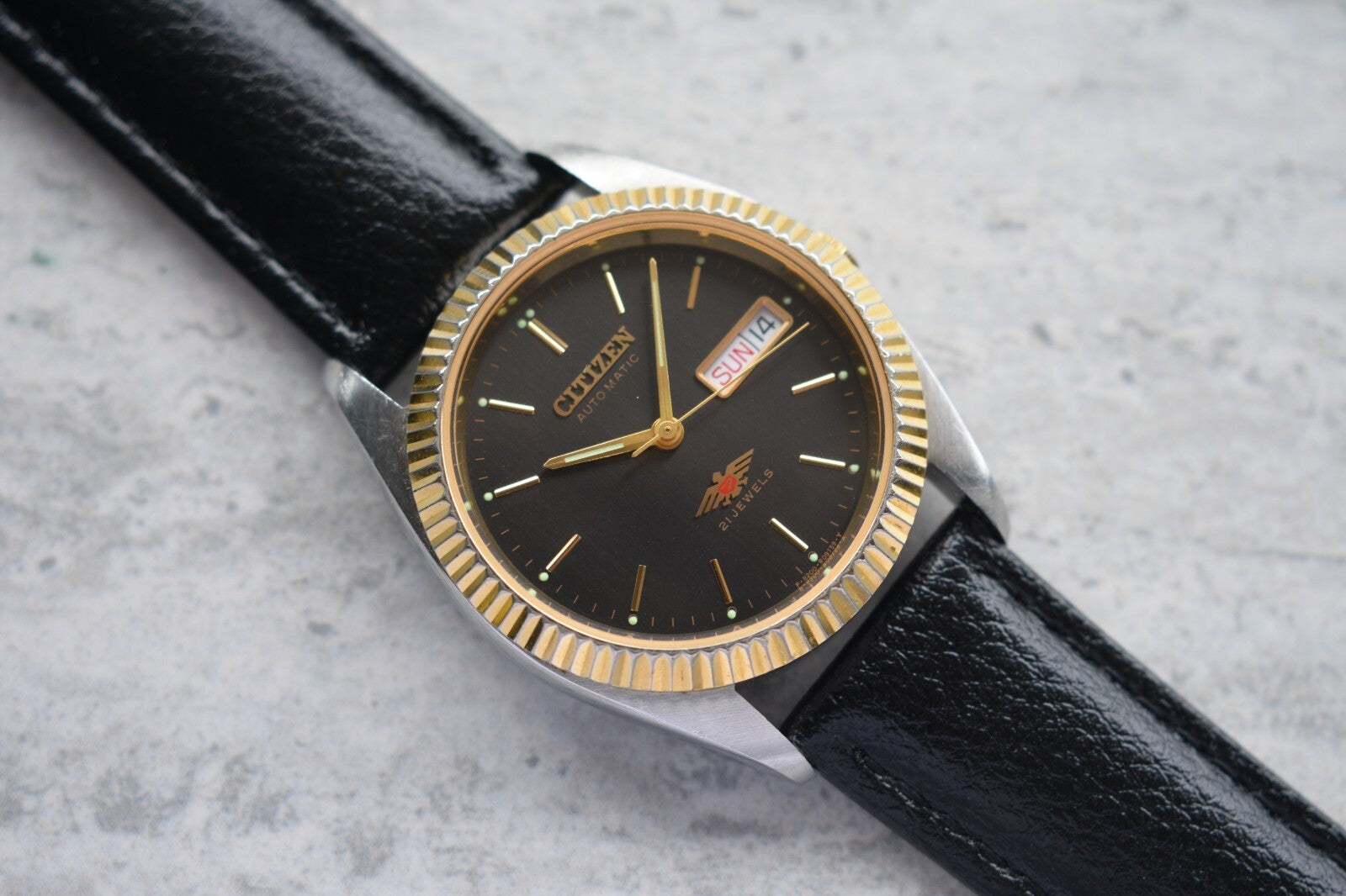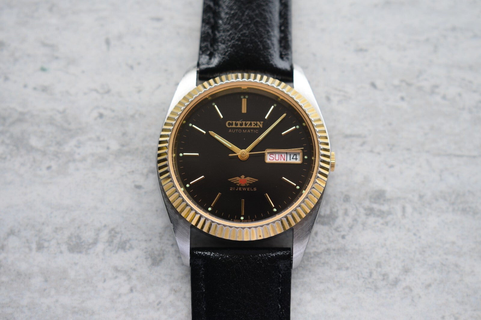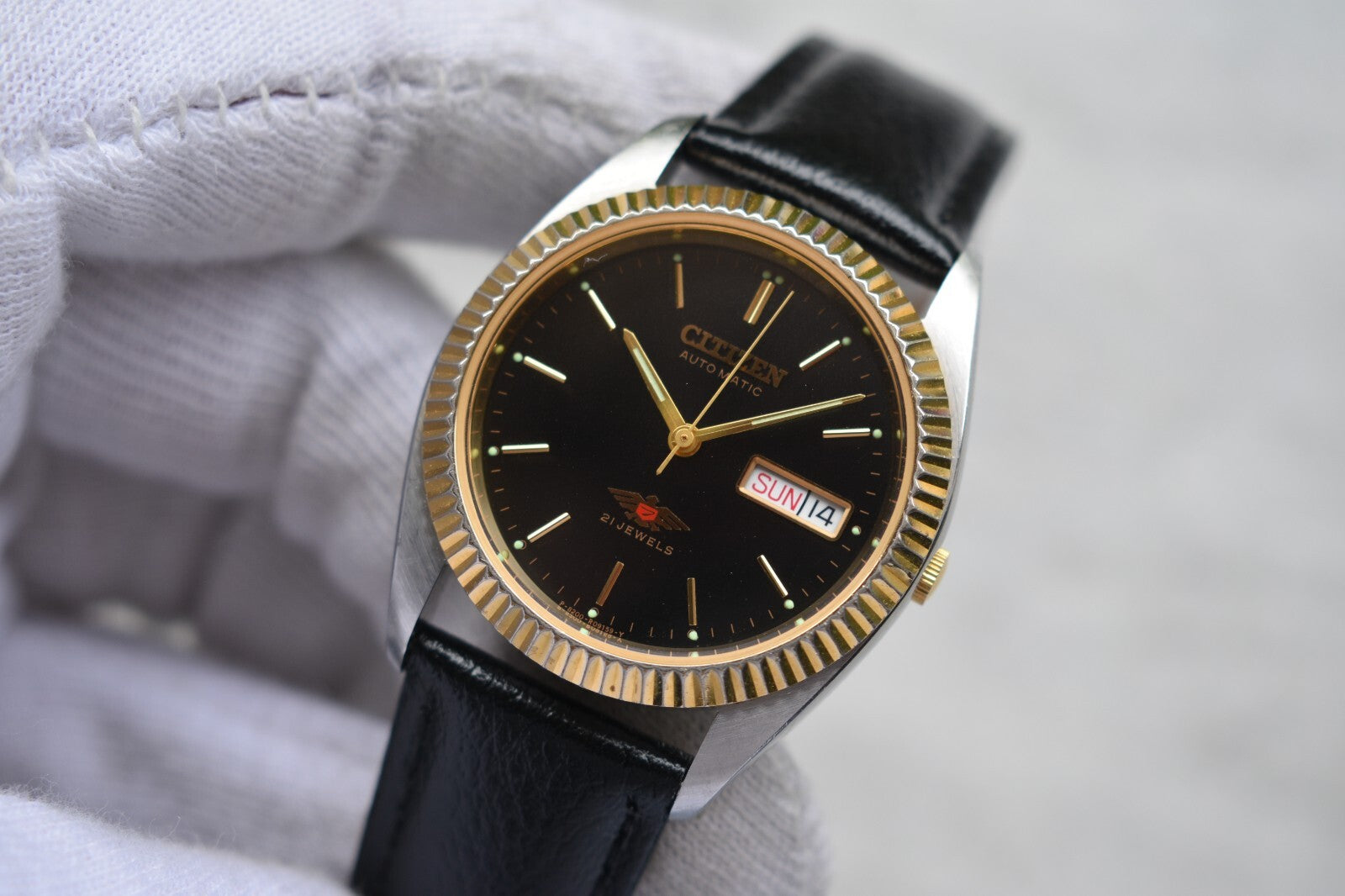 May 1997 Vintage Citizen Eagle 7 Automatic Men's Fluted Black Dial Leather Watch