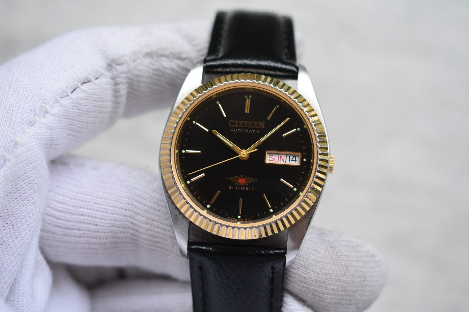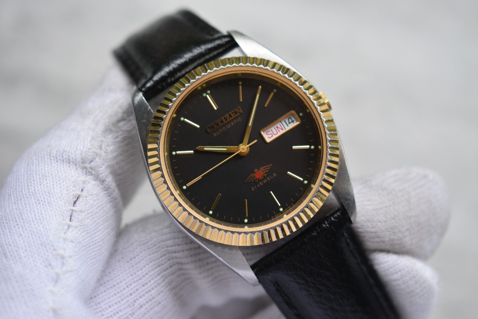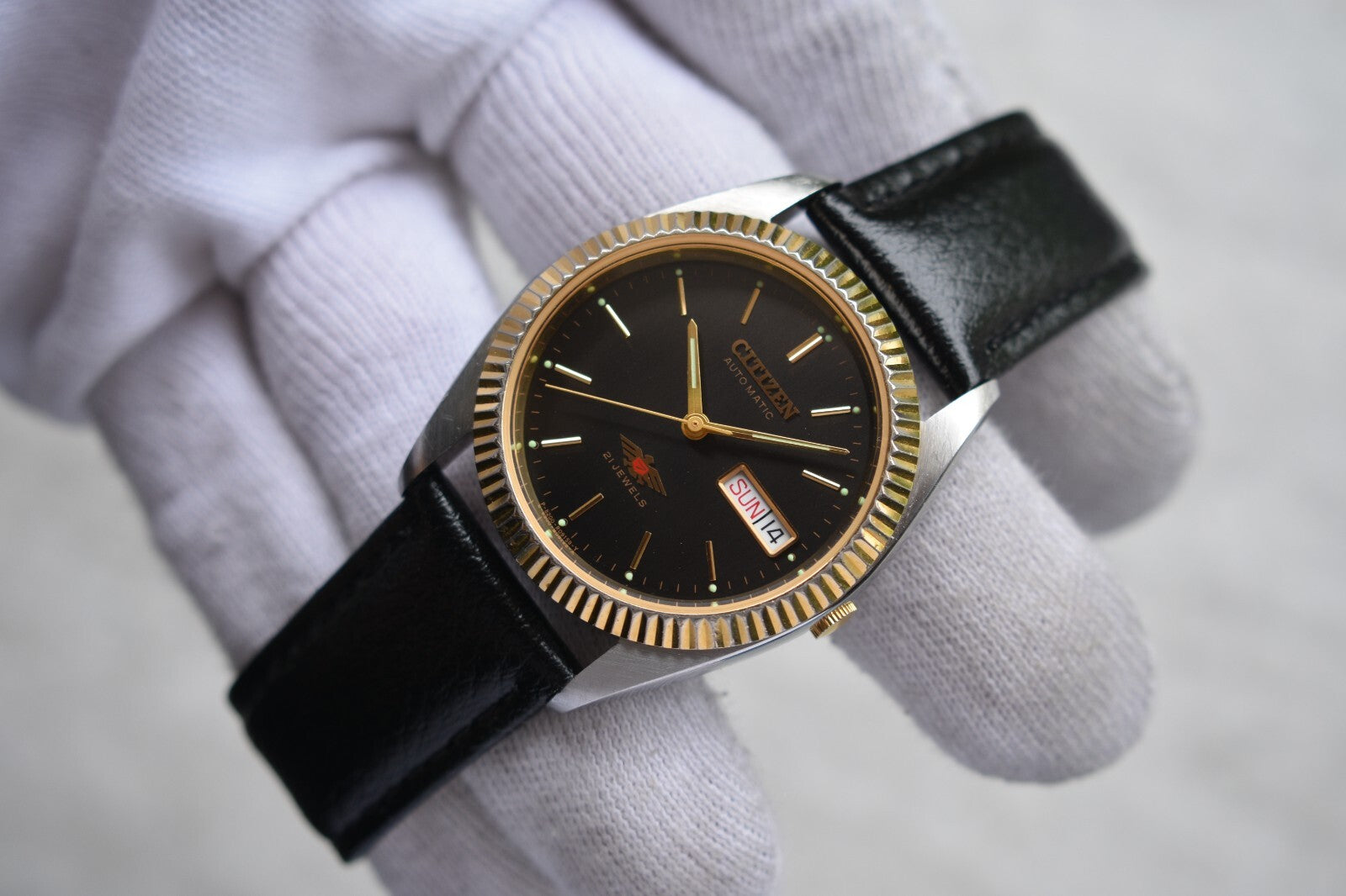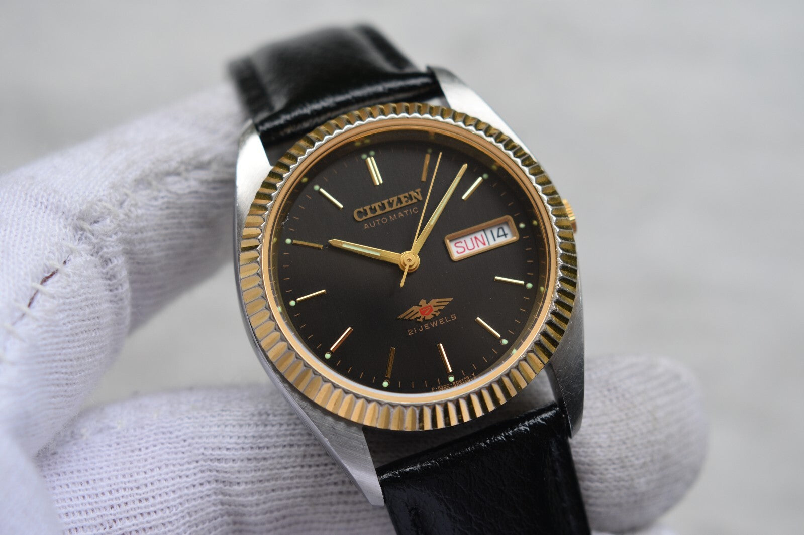 May 1997 Vintage Citizen Eagle 7 Automatic Men's Fluted Black Dial Leather Watch
