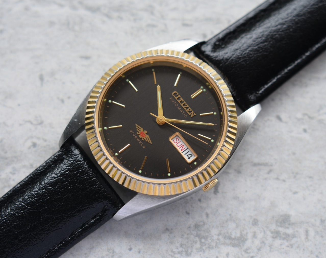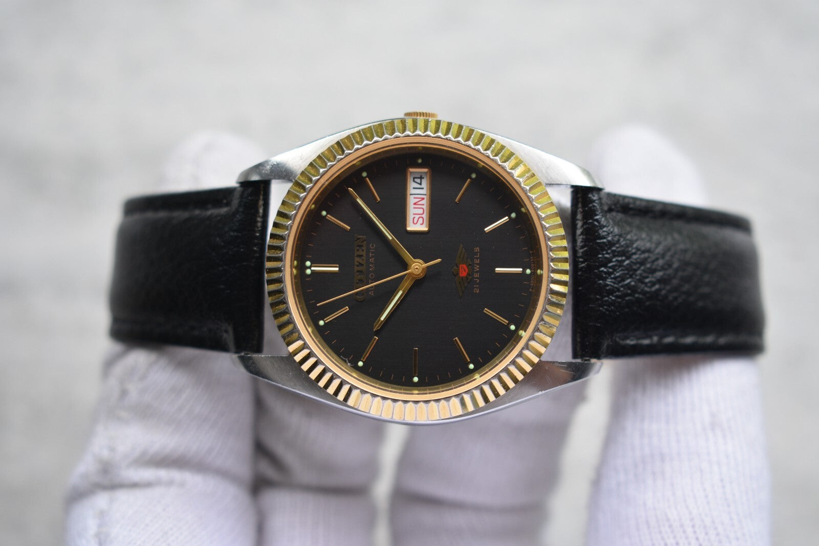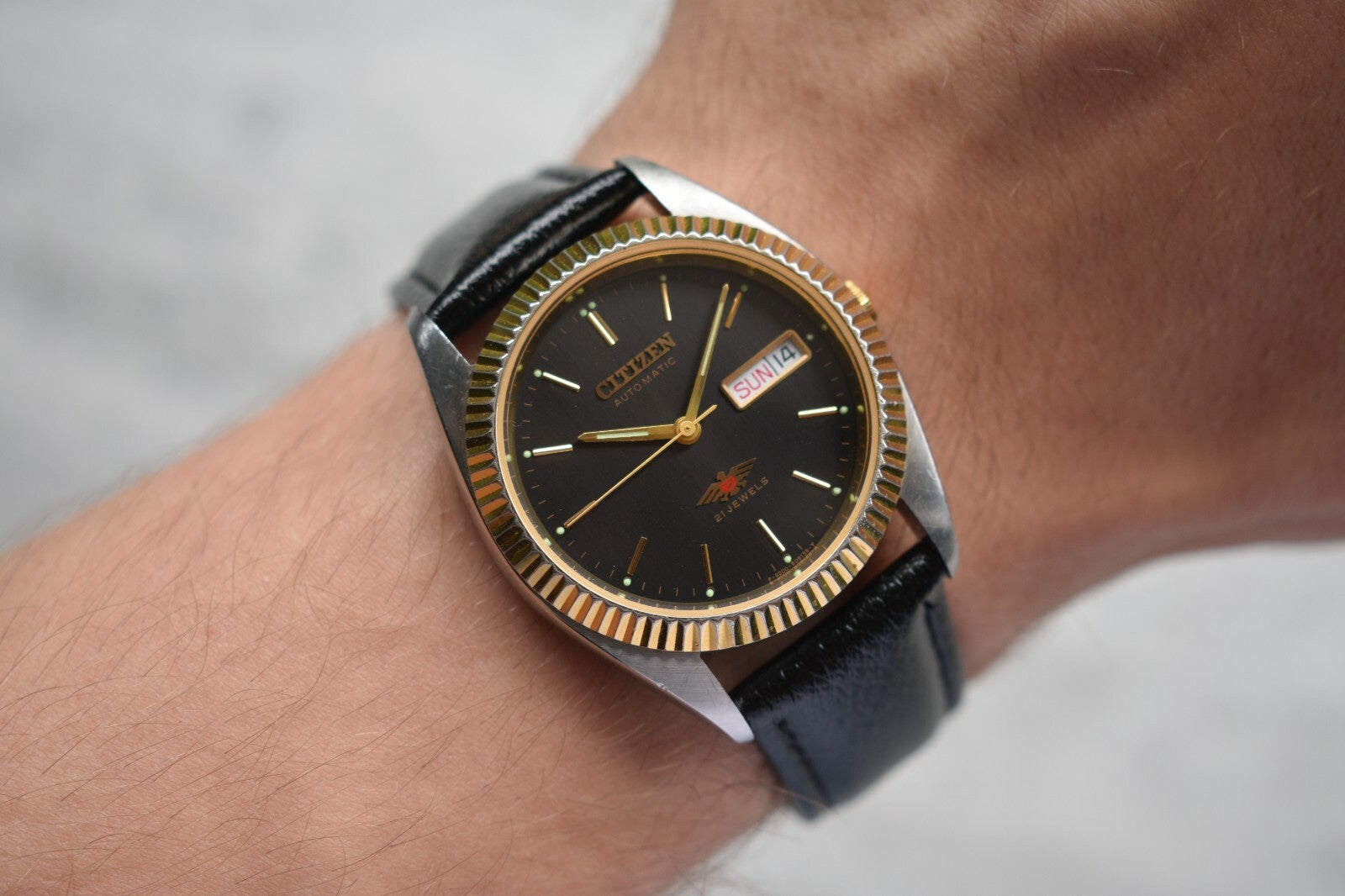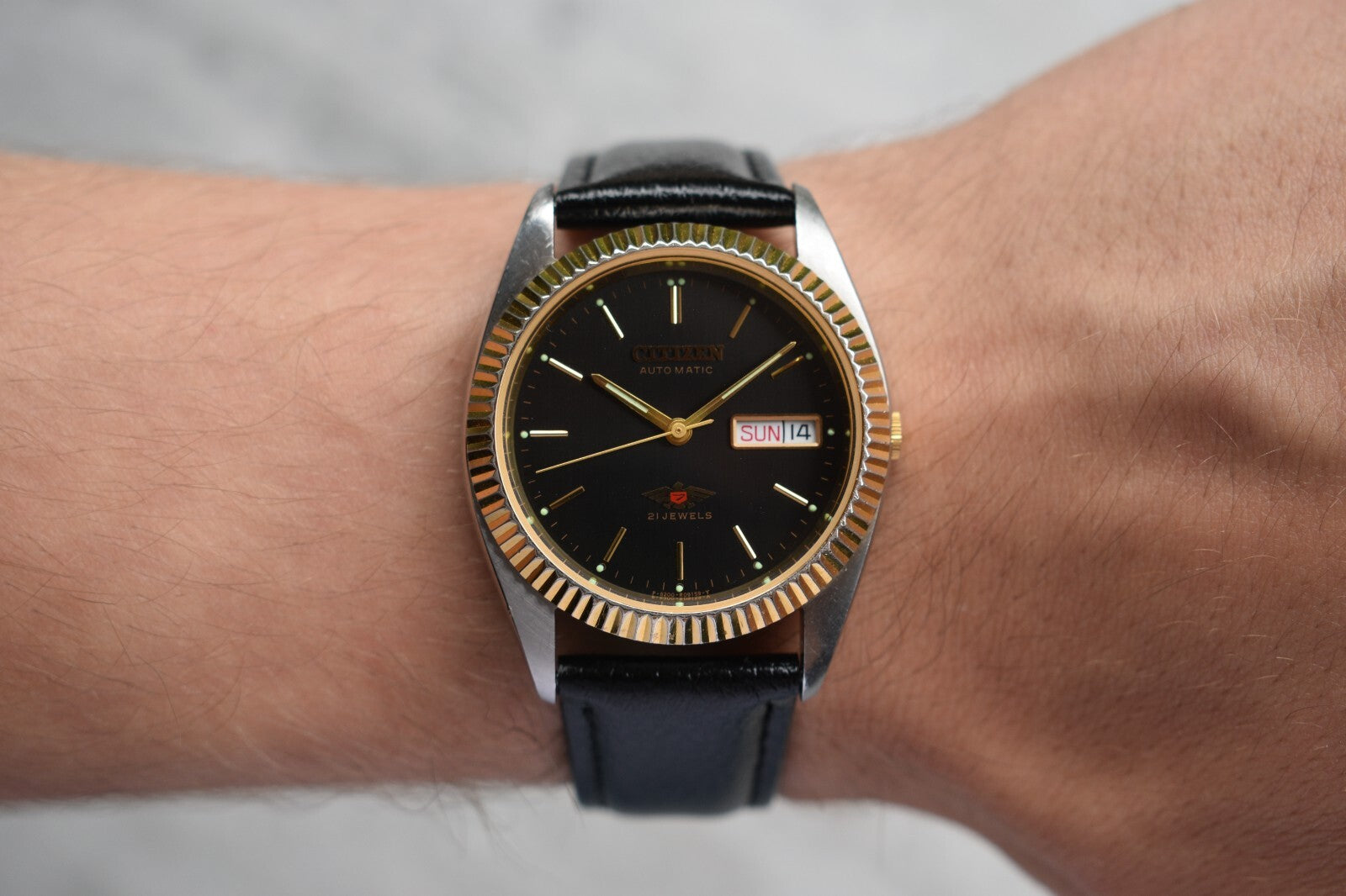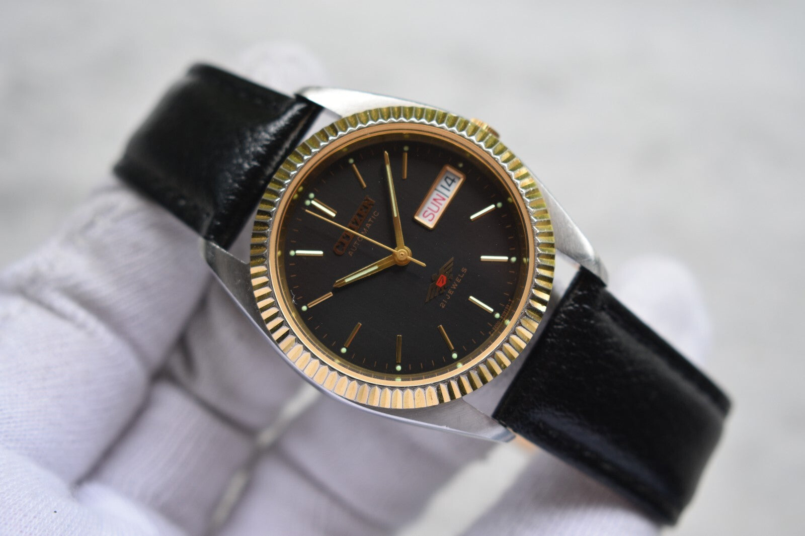 May 1997 Vintage Citizen Eagle 7 Automatic Men's Fluted Black Dial Leather Watch