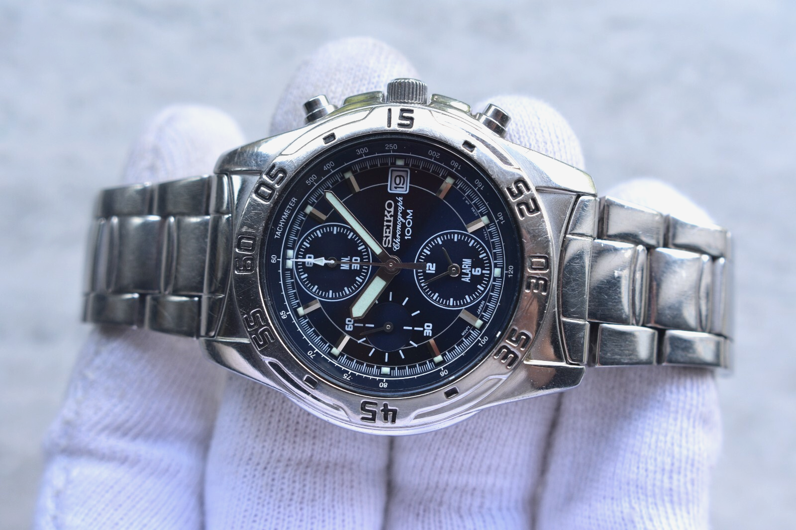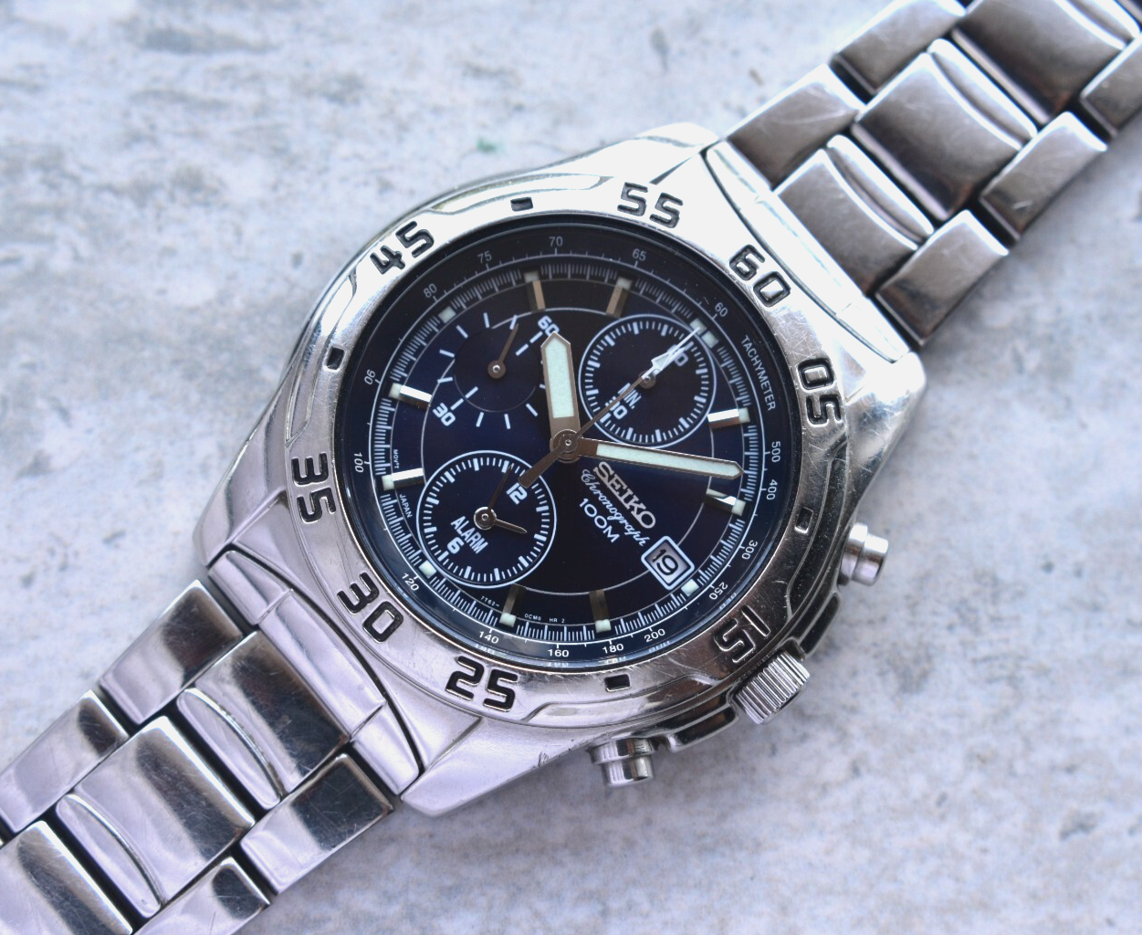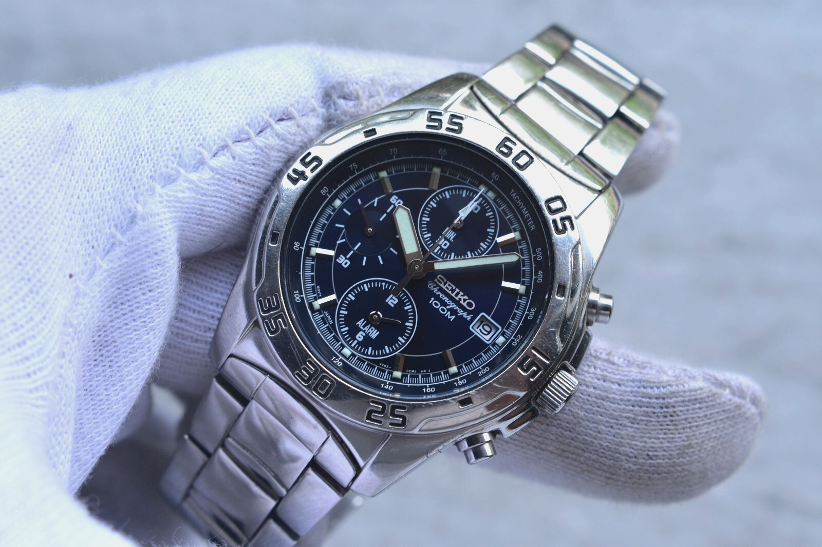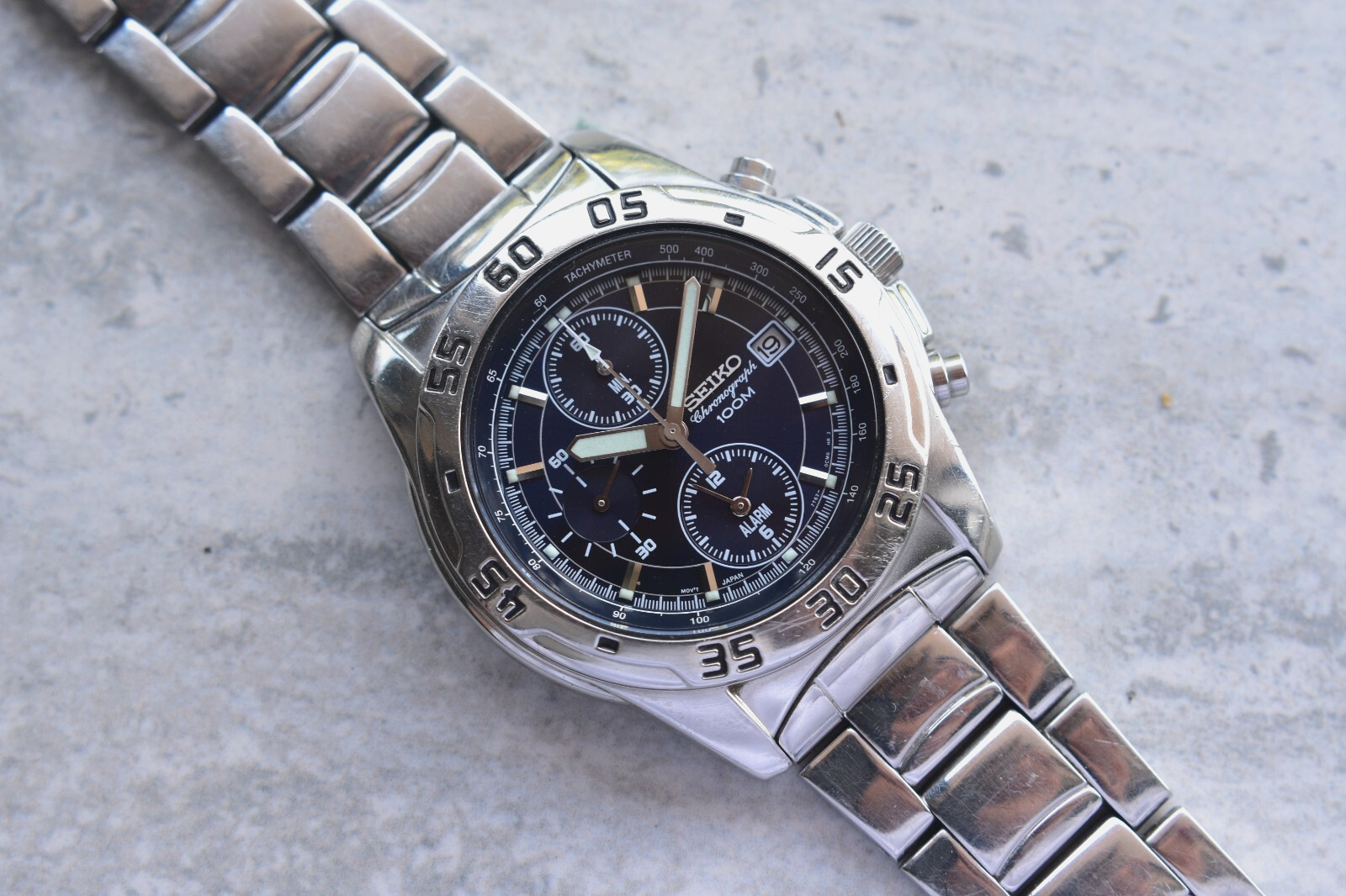 Seiko 100m Chronograph Blue Dial Date Men's Quartz Bracelet Rare Watch
