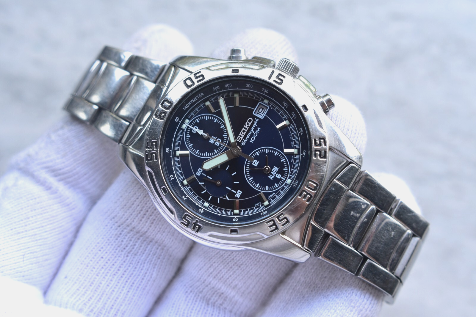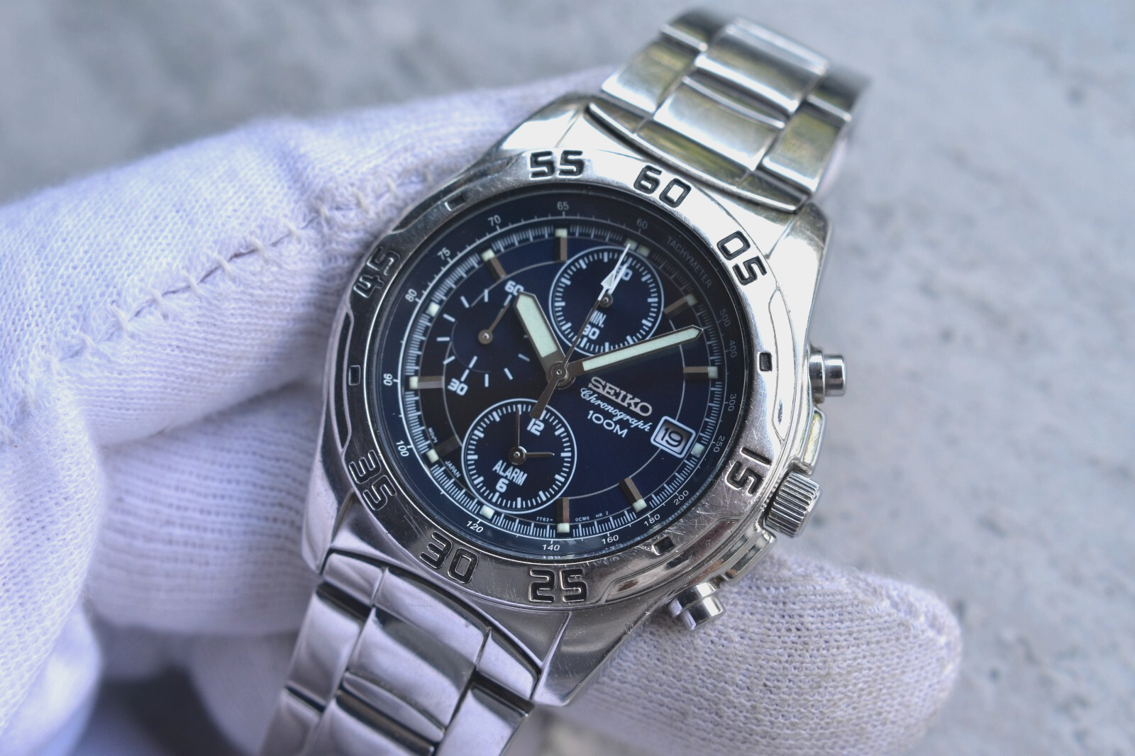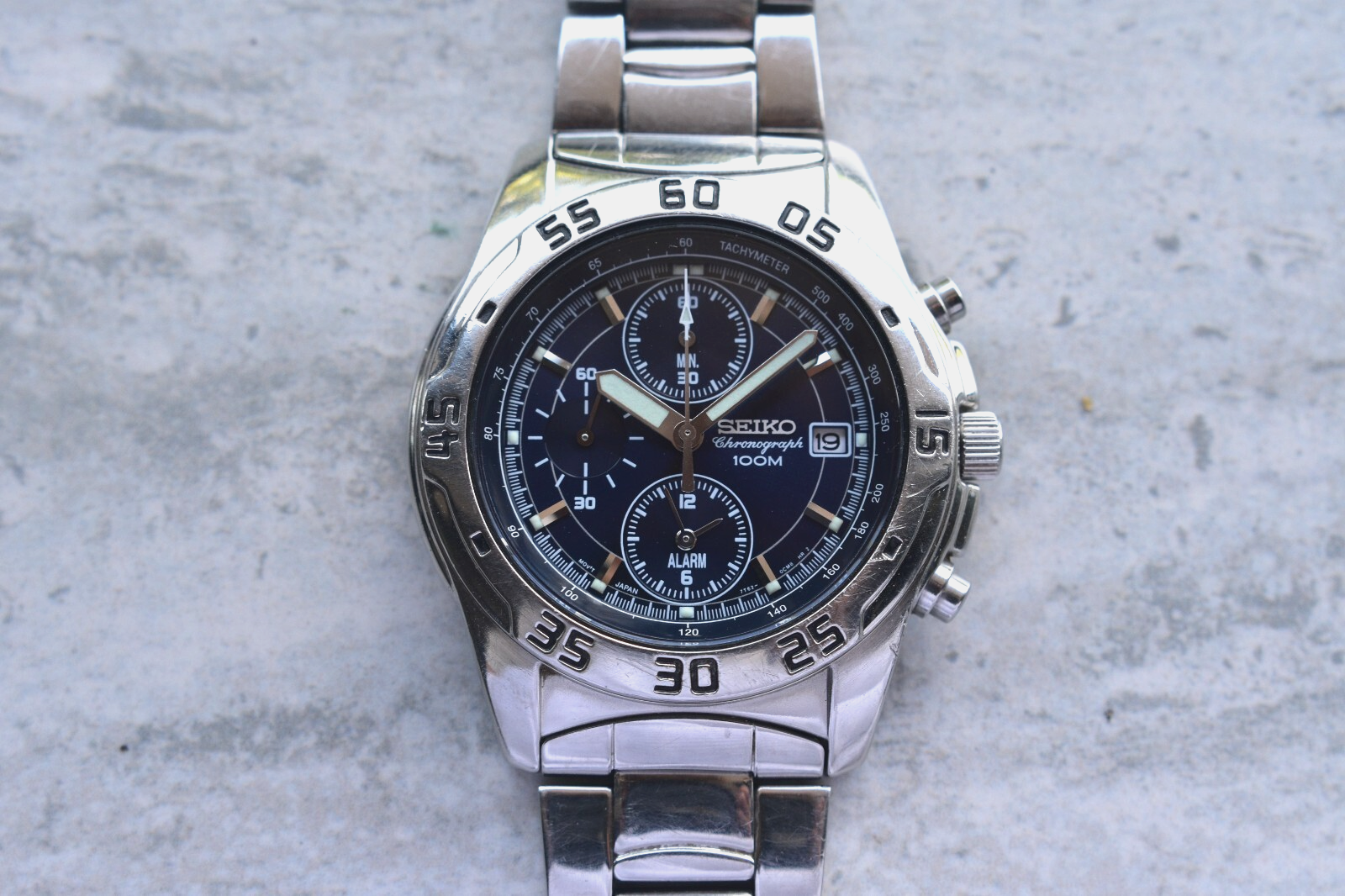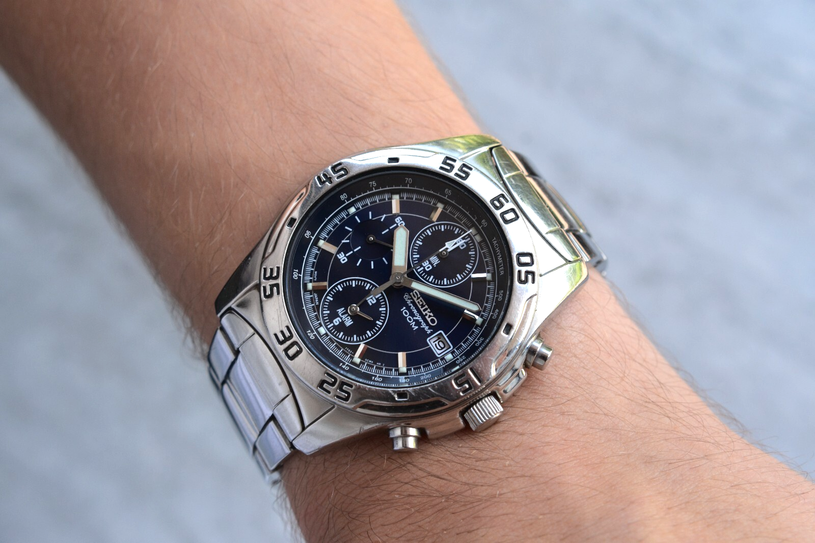 Seiko 100m Chronograph Blue Dial Date Men's Quartz Bracelet Rare Watch