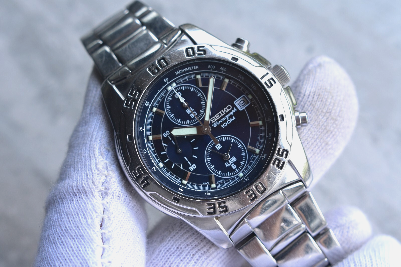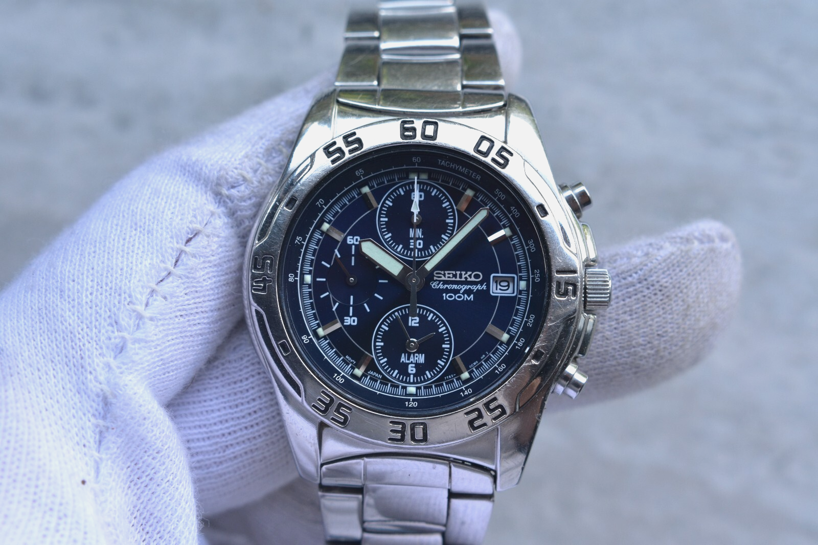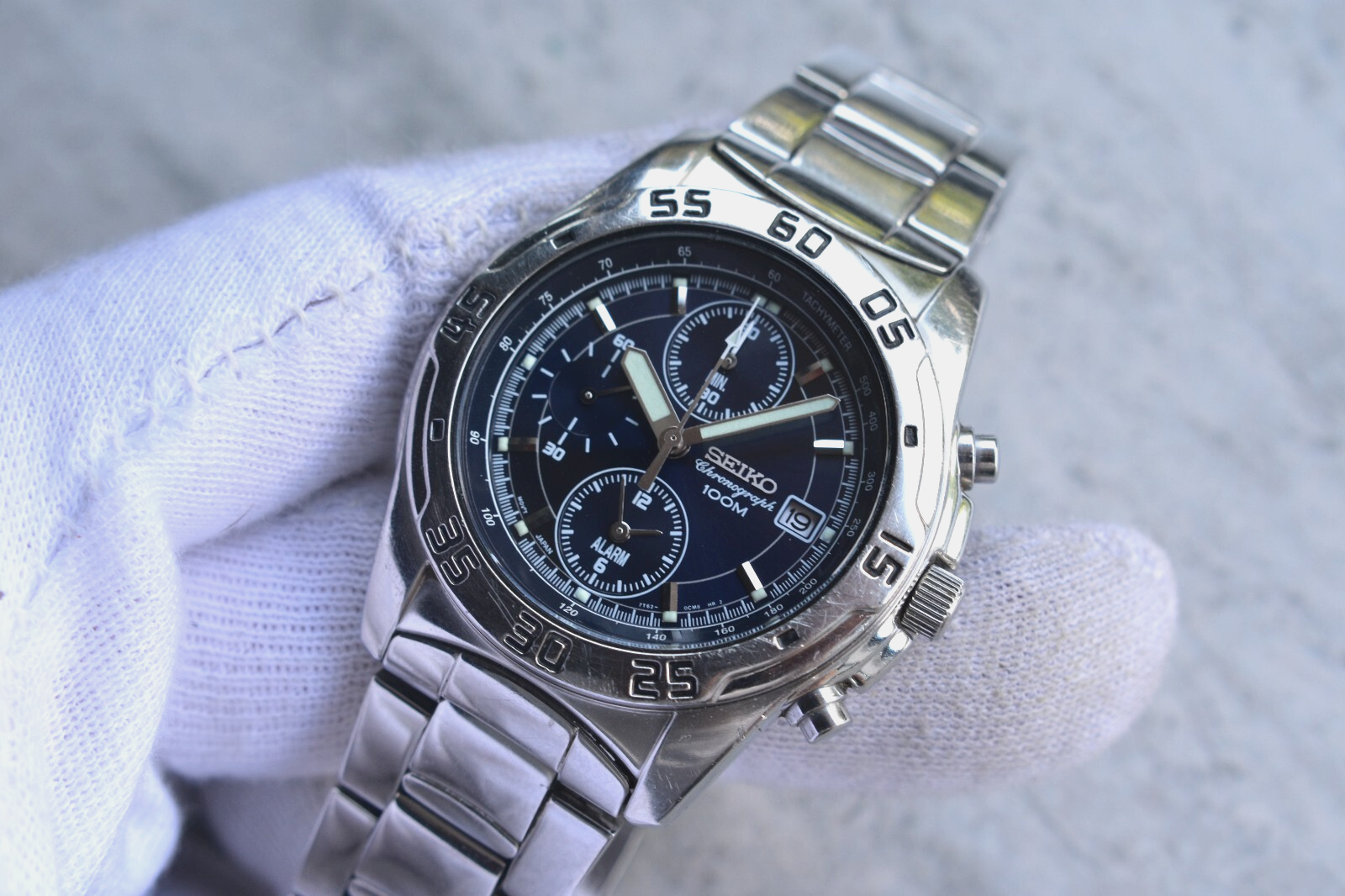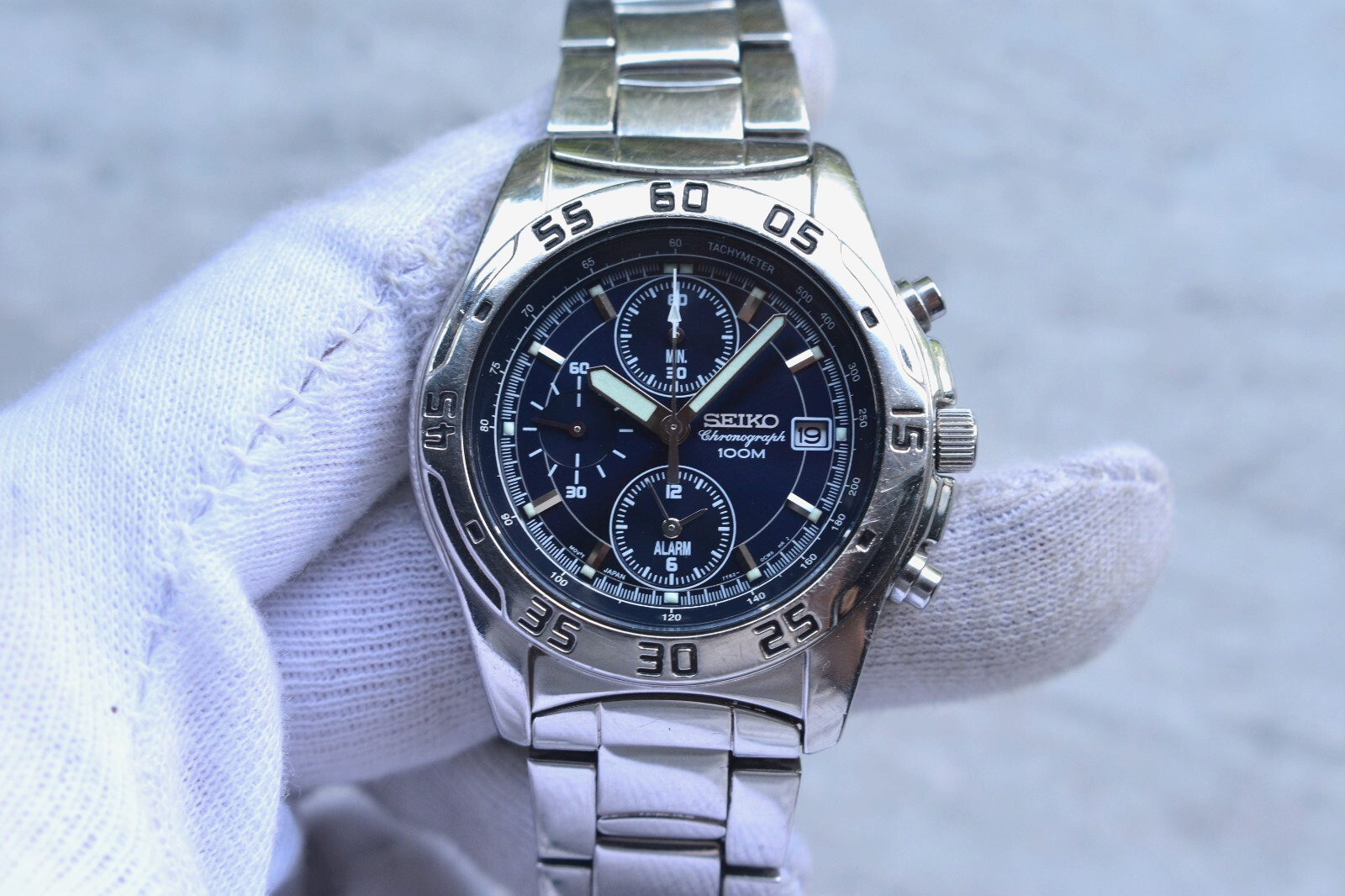 Seiko 100m Chronograph Blue Dial Date Men's Quartz Bracelet Rare Watch