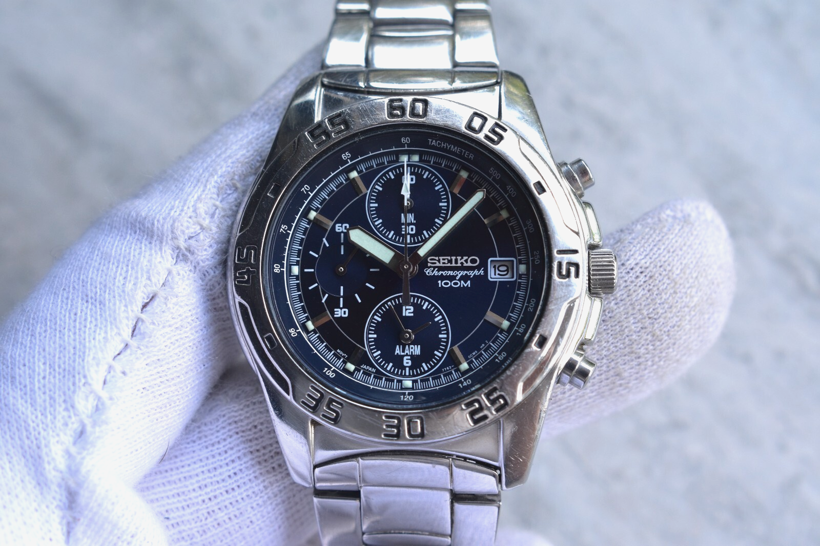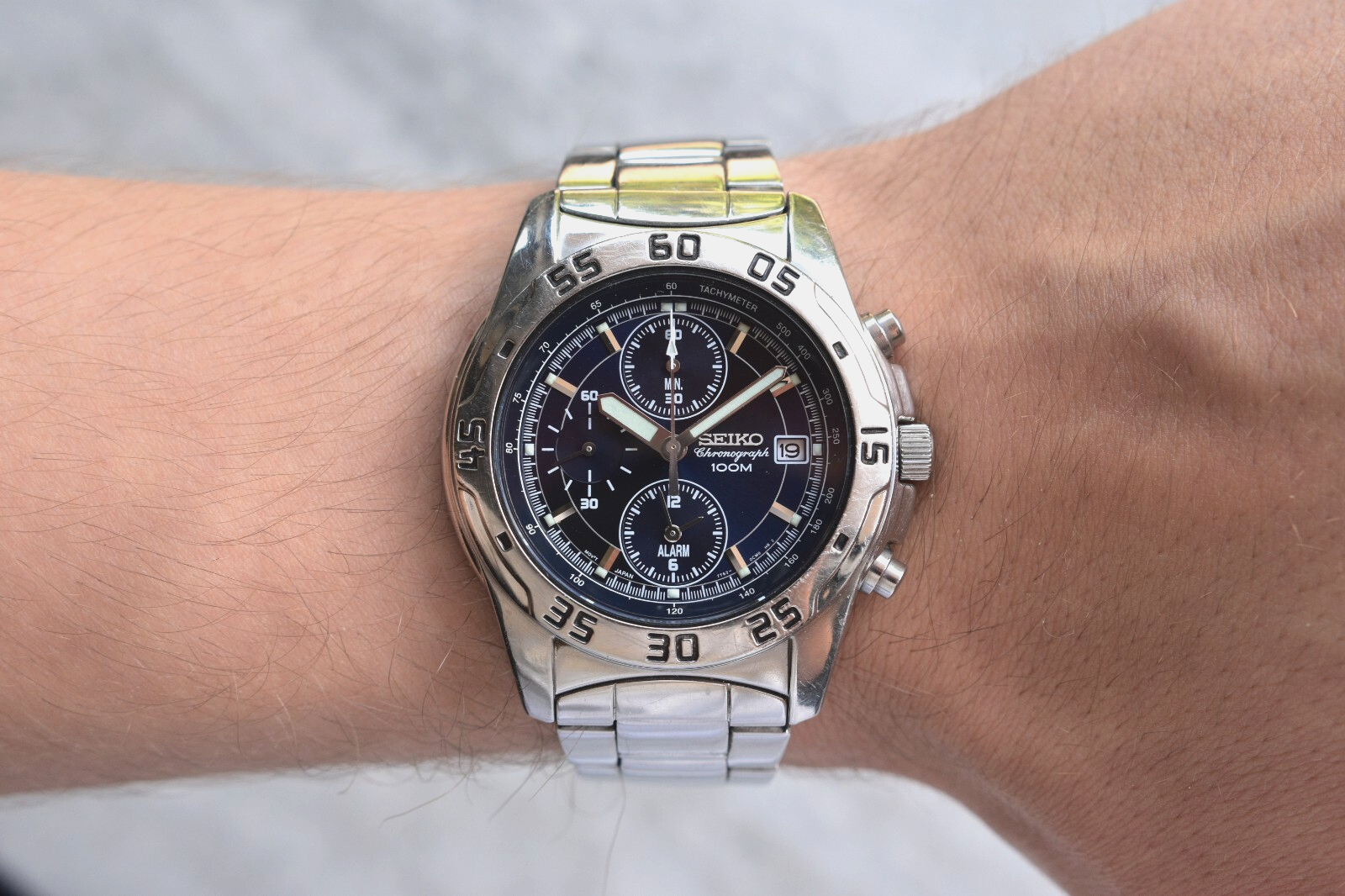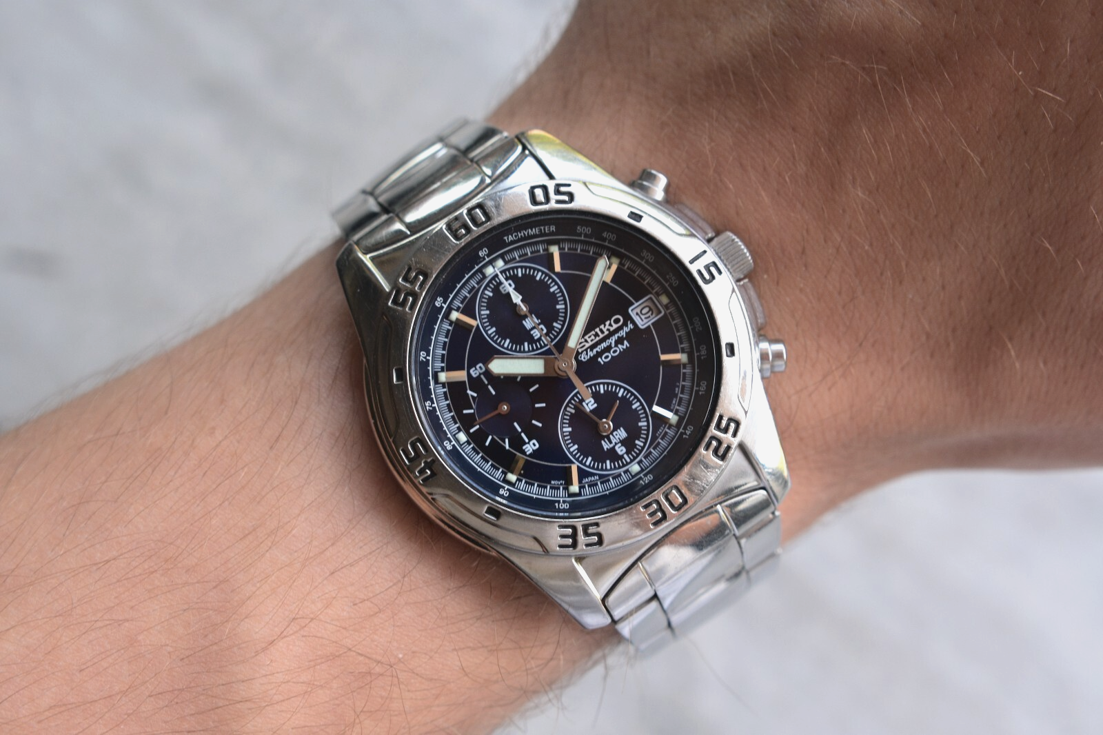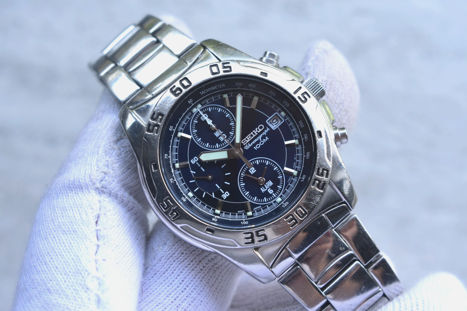 Seiko 100m Chronograph Blue Dial Date Men's Quartz Bracelet Rare Watch